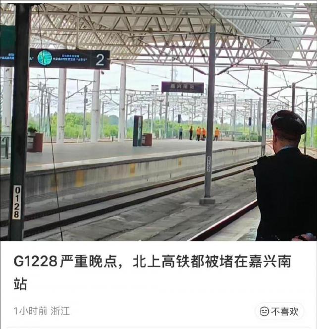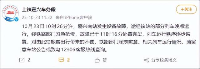10 月 23 日 10 时 26 分许,嘉兴南站发生设备故障,途经该站的部分列车晚点运行。经铁路部门紧急抢修,故障已于 11 时 16 分处置完毕,列车运行秩序逐步恢复。对由此给旅客出行带来的不便,铁路部门深表歉意。相关列车运行情况,请留意车站公告或致电 12306 客服热线查询。